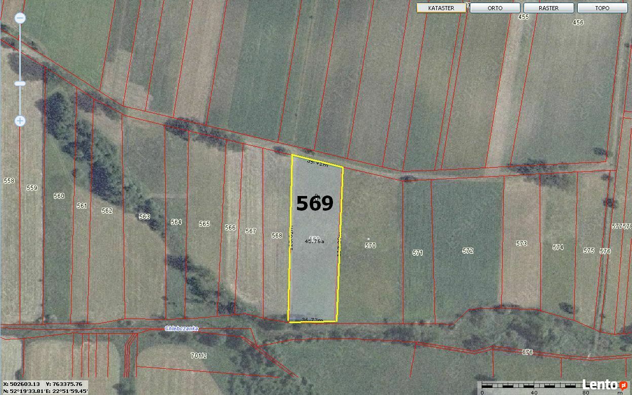 Na sprzedaż działka rolnaOferuję na sprzedaż atrakcyjną działkę rolną o powierzchni 4639 m, położoną w malowniczej okolicy Chlebczyn gmina Sarnaki powiat Łosice numer działki 569